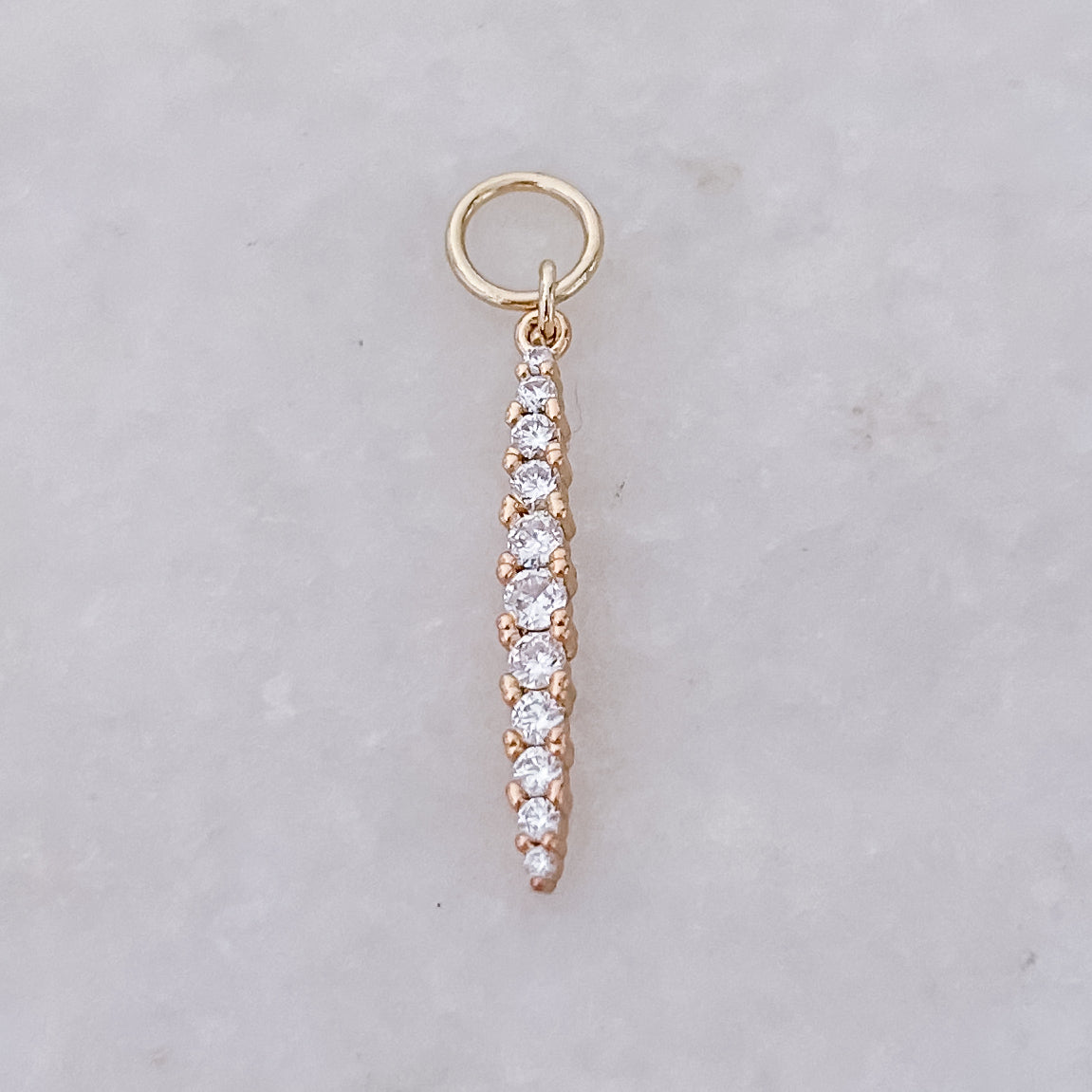 Dit prachtige bedeltje met witte steentjes onder elkaar symboliseert zuiverheid en verfijning. Voeg dit stralende bedeltje toe aan je collectie en laat de tijdloze schoonheid van de witte steentjes je stijl verfraaien!